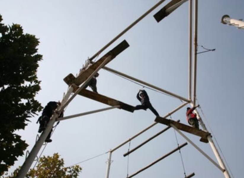 高空斷橋這個項目就是在距離地面高度為8米的高空搭起了一座獨木橋,而這個橋的中間卻是斷開的,間距1.2米-1.4米,要求所有隊員爬上8米的高空后,從一側邁到另一側,再從另一側...