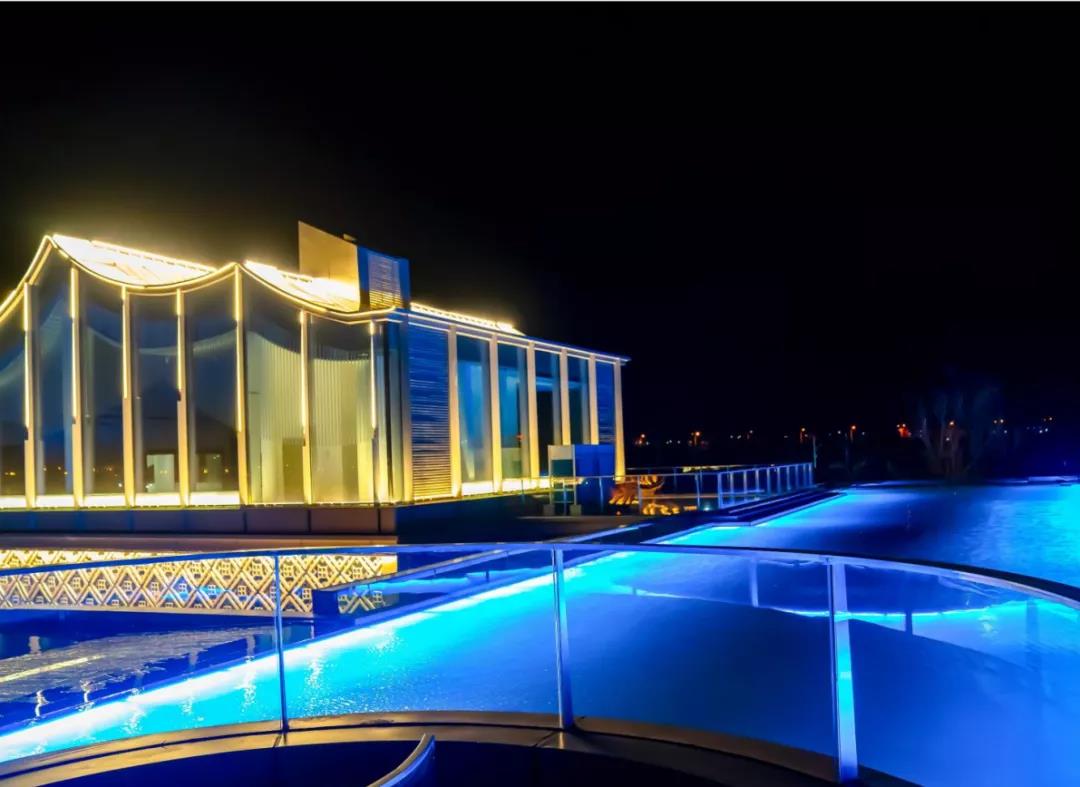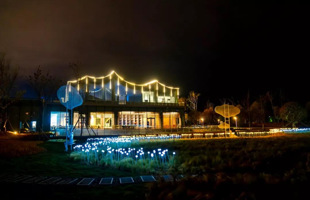 夕陽遲暮,霞光輕灑身上,自然有趣,時間仿佛靜止一般,也跟著安靜下來。直到展示區(qū)主體的燈帶點亮,彩色的光影映在水中,破開這片幽靜的夜色。