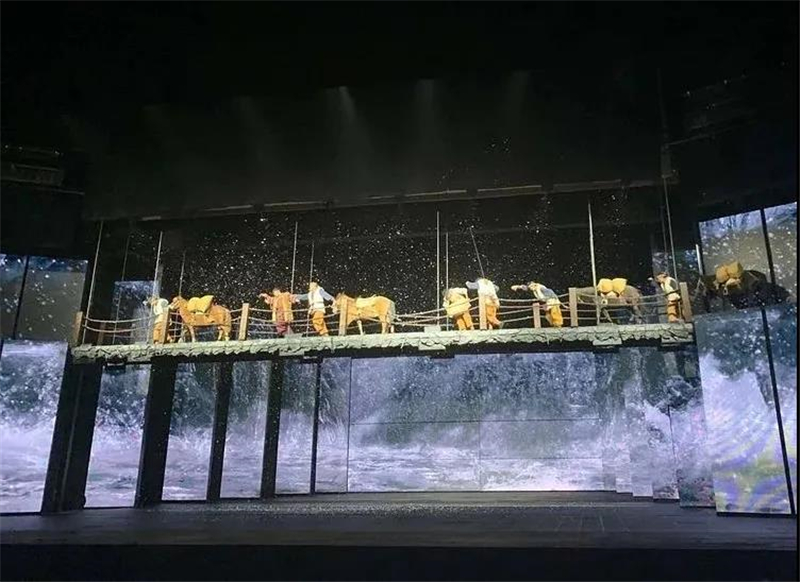 當(dāng)你走進(jìn)劇場,一個(gè)人工崖壁首先進(jìn)入眼簾,它以美麗的玉龍雪山作為舞臺(tái)背景,當(dāng)你在觀看表演時(shí)仿佛看到了六百年前茶馬古道上的剽悍馬幫穿行的場面,給你帶來的視覺沖擊力十分強(qiáng)勁。