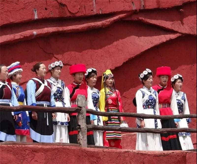 而更加震撼的是,全場沒有一個(gè)專業(yè)演員,在你眼前呈現(xiàn)的每一個(gè)演員都是來自本地、皮膚黝黑的原住民。這里沒有燈光、沒有舞美,在蔚藍(lán)的天空下他們唱著自己的歌,跳著自己的舞訴說著自己的故事,讓你感受到來自少數(shù)民族的粗獷、原生態(tài)和質(zhì)樸,把最真實(shí)的麗江印象帶給來到這里的每一個(gè)人。