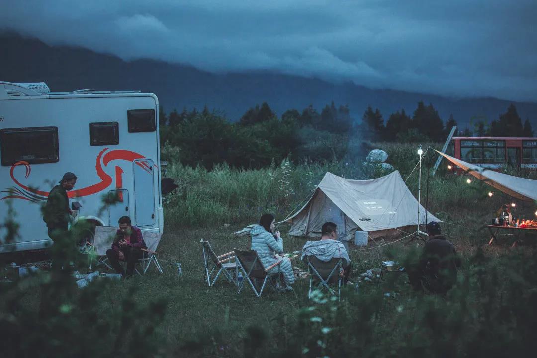 在群山中藏著的一片空地,周圍一圈圈狗尾草,幾頂帳篷放置其間。在草地上鋪一塊毯子,往上一坐就是舒適愜意的田園隱居生活。