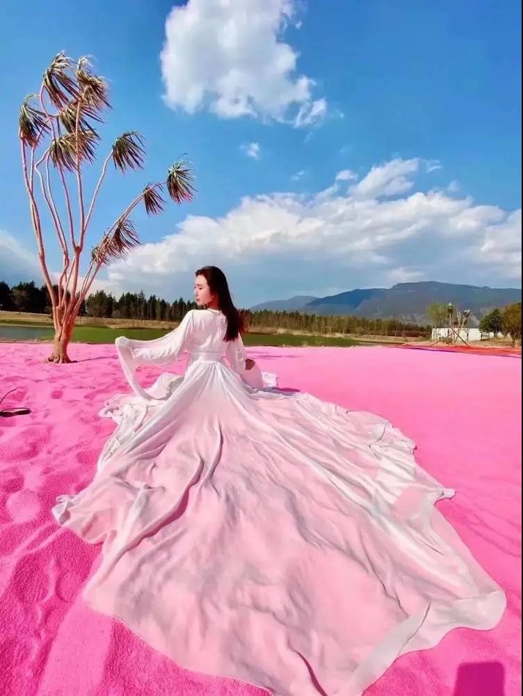 將粉色散落在海灘上