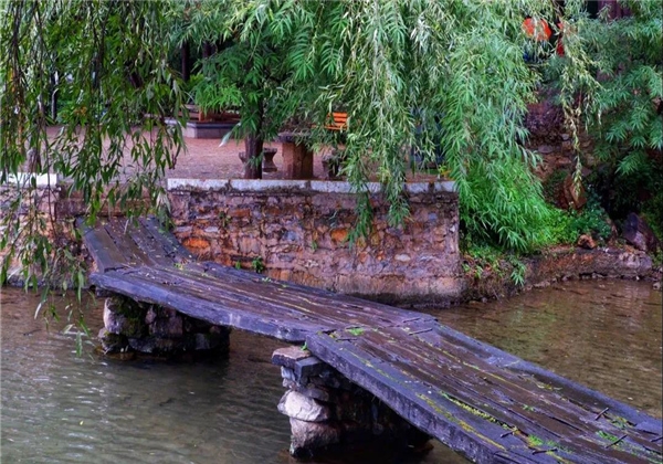 過了五孔橋不久,耳邊便傳來了陣陣古樂聲。朝前細(xì)看,古戲臺(tái)上十幾位老人正在表演納西古樂。在雨中觀看這樣的表演,不禁多了幾分凄美的意境,別有一番韻味。
