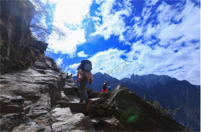 沿著高路步道繼續(xù)前行,一路走過驚險(xiǎn)的崖邊步道,沿途盡是面朝玉龍雪山群峰,俯視雪山下的大峽谷,景色無比震撼。最后抵達(dá)本地灣入住今晚的客棧,天氣好的情況下可以欣賞玉龍雪山的日落與夜晚的無盡星空