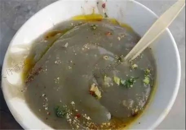 漫步在麗江古城或者古鎮(zhèn)的小道上,你可以看到一種被稱作“雞豆涼粉”的特色小吃。這是一種由產(chǎn)于麗江的雞豆所制作而成的,顏色呈灰綠色的小吃。