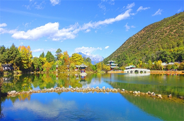 說(shuō)來(lái)也奇怪,這條橋把黑龍?zhí)斗殖蓛蓚€(gè)池,照片左側(cè)的池水深且清澈,右邊的池水淺且微渾。當(dāng)?shù)厥忻裥蓍e時(shí)間會(huì)在這里游玩喂魚(yú),他們也都很自覺(jué)地只喂右邊池里的魚(yú)。我想麗江這么美跟當(dāng)?shù)孛癖姷膼?ài)護(hù)也是有很大關(guān)系的吧。