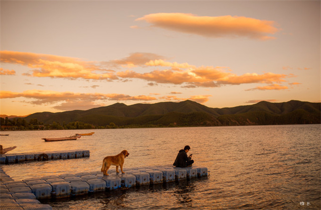 這里的日落依舊迷人。七年之前我看過的是草海的日落,七年之后我看到了達(dá)祖碼頭的日落。我太羨慕這個(gè)帶著金毛一起來的小哥了,狗和主人一起坐在湖邊,感受著日落時(shí)刻每一分每一秒的美好。