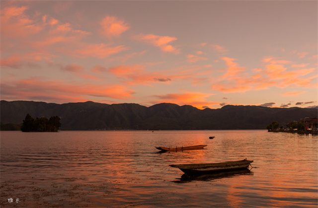 這里的日落依舊是天空之鏡,云由白色變成了夢(mèng)幻的橙紅色,彩色的天空將整個(gè)湖面都染上了迷人的色彩。這里,依舊是我心中最美的瀘沽湖。它也是我心中最浪漫的瀘沽湖。