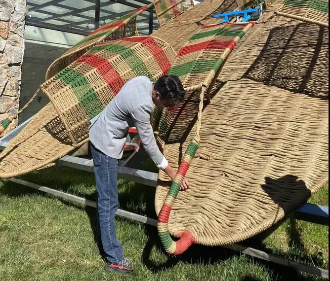 楊紹君說:“現(xiàn)在手工做草鞋的人已經(jīng)越來越少了,當(dāng)這個(gè)文化失傳了以后,那我們就只能看到‘草鞋’這兩個(gè)字,并不知道這個(gè)實(shí)實(shí)在在的東西,它是長(zhǎng)什么樣子的,我希望用這樣一個(gè)很有視覺沖擊力的表現(xiàn)形式,讓更多的人去知道和認(rèn)識(shí)草鞋編織文化?!?