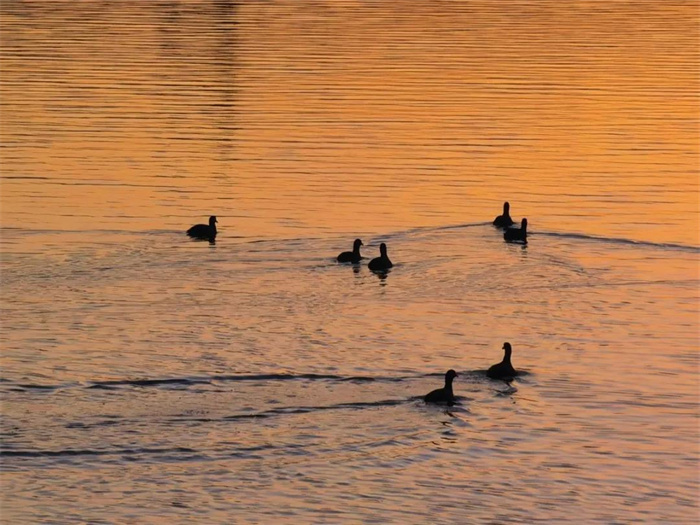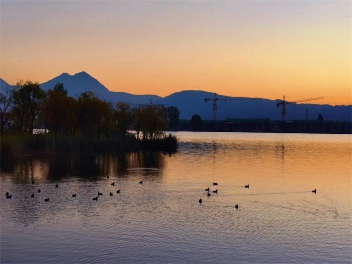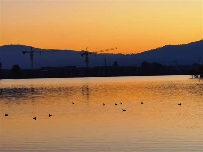 湖水、蘆葦蕩、高山、晨曦連成一片,