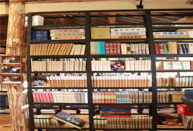 宣科書房位于納西古樂會的二樓,書房里上萬冊的圖書都是從宣科先生的家中搬來的,這些都是宣科先生的藏書。從地方志到中外文學(xué)、音樂名著,甚至是家中孩子看的各年齡段的繪本,都有。在這里,各個年齡段的人都能找到一本適合自己的書。