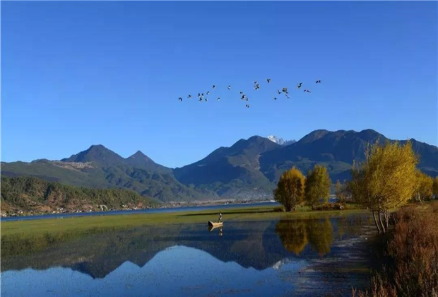 漫步拉市海濕地公園,藍天白云下,濕地里的小花和綠草在習(xí)習(xí)微風中搖蕩,一梭魚船穿過花叢,水波輕輕地拍打水草,聲如天籟。