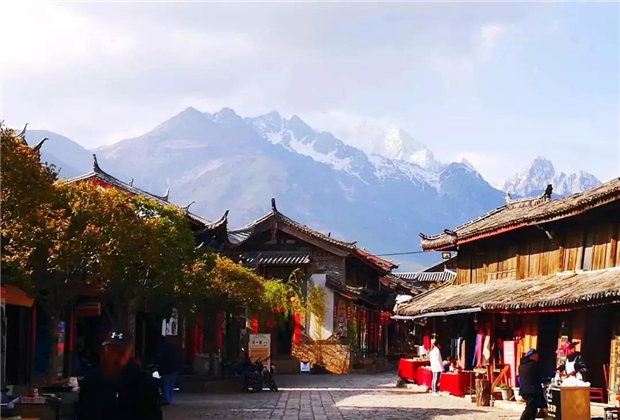 一座古樸,美麗村落鑲嵌在玉龍雪山腳下