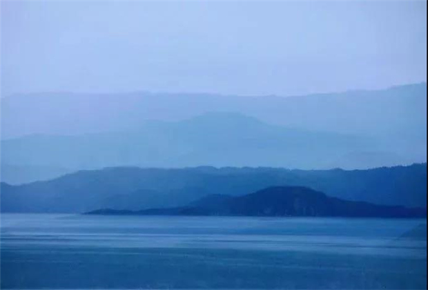 清晨,山巒晨霧,湖籠青煙,紅霞隱約。