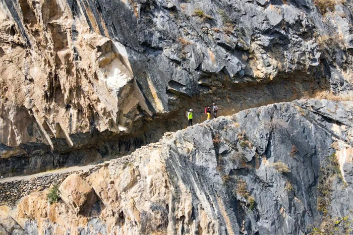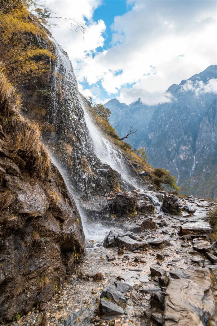 在客棧早餐后出發(fā),沿途邊走邊欣賞磅礴的峽谷風光。今天有許多山間橫切的陡峭路段,需要格外小心。出發(fā)后繞過幾道大彎,便到達龍洞瀑布,如一條銀鏈懸掛山間,水流奔騰而下,極為壯觀!