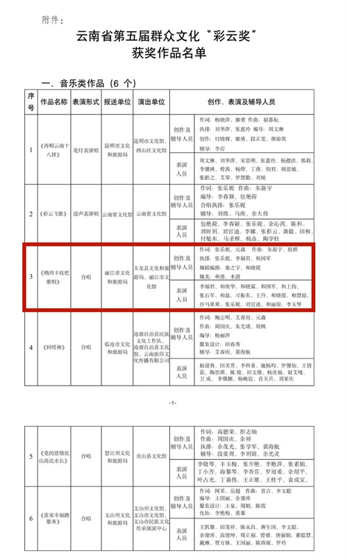 近日? 云南省文化和旅游廳公示了? 云南省第五屆群眾文化“彩云獎(jiǎng)”? 獲獎(jiǎng)作品名單? 麗江市有2個(gè)作品擬獲獎(jiǎng)省文根據(jù)《云南省第五屆群眾文化“彩云獎(jiǎng)”評(píng)獎(jiǎng)辦法》,省文化和旅游廳組織開展了云南省第五屆群眾文化“彩云獎(jiǎng)”評(píng)獎(jiǎng)工作。經(jīng)專家評(píng)委評(píng)審并報(bào)送云南省第五屆群眾文化“彩云獎(jiǎng)”活動(dòng)組委會(huì)審議,形成了云南省第五屆群眾文化“彩云獎(jiǎng)”獲獎(jiǎng)作品名單。