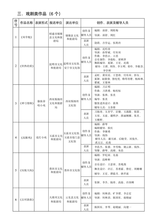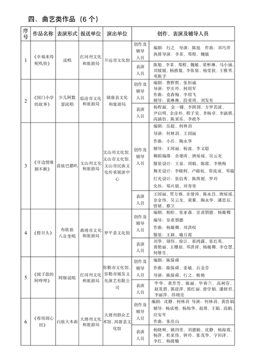 現(xiàn)將云南省第五屆群眾文化“彩云獎(jiǎng)”獲獎(jiǎng)作品名單予以公示,公示期自即日起7個(gè)工作日(11月8日—11月16日)。如有異議,請(qǐng)?jiān)诠酒趦?nèi),以書面方式實(shí)名反映,并提供異議理由和有關(guān)依據(jù)、證據(jù),以及反映人姓名、工作單位(或反映機(jī)構(gòu)名稱)、聯(lián)系方式。
