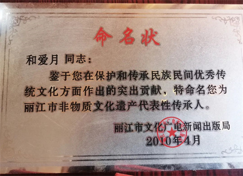 2010年4月,和愛(ài)月被命名為麗江市非物質(zhì)文化遺產(chǎn)代表性傳承人。