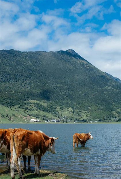 藍(lán)天白云,雪山下天然的清澈湖畔,四面環(huán)山圍
