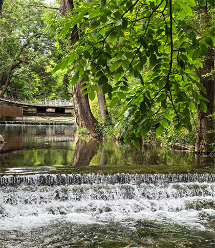 九鼎龍?zhí)兜乃鲎札埲缴侥_的石頭縫隙里,潭水不深,但卻夏季不渾,冬季不淺,一股清澈的流水從石隙中溢出,永遠滋潤著古鎮(zhèn)。潭周綠柳垂地,翠柏指天,泉水清澈,潭中游魚甚多,被當?shù)厝朔顬樯耵~。民間傳說,凡是偷吃龍?zhí)渡耵~者,都會遭災禍。由此,神魚得到保護,自我繁衍,悠閑地在泉水中生息。