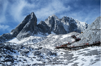 語中被稱為“歐魯”,意為銀色的山巖。其銀裝素裹,十三座雪峰連綿不絕,宛若一條“巨龍”騰越飛舞,故稱為“玉龍”。又因其巖性主要為石灰?guī)r與玄巖,