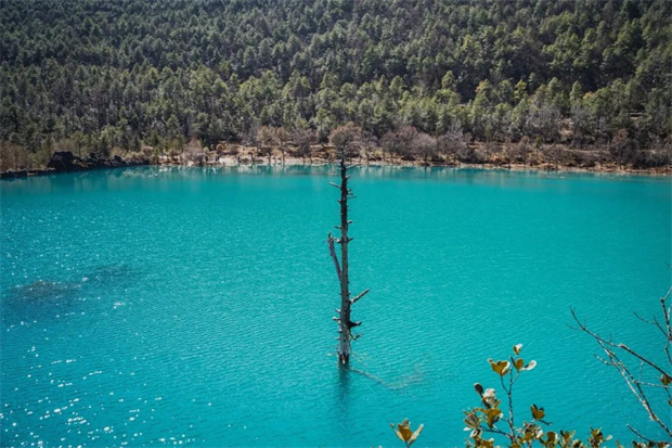 扎進(jìn)翡翠秘境中,藍(lán)月谷像春天打翻的調(diào)色盤,陽光下的湖水泛起明艷的藍(lán),潭水倒映著岸邊的景色和遠(yuǎn)處的雪山,棧
