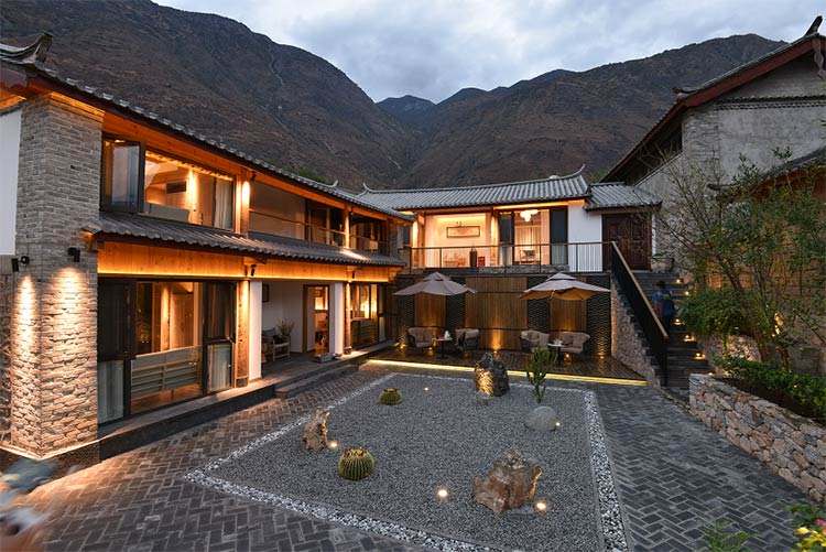 麗江寶山石頭城棲云山房位于麗江城北110公里的金沙江峽谷中的寶山石頭城上,因百余戶人家聚居在一座獨(dú)立的蘑菇狀巨石之上而得名。麗江寶山石頭城納西語(yǔ)稱為“拉伯魯盤(pán)塢”,意為“寶山白石寨”,城內(nèi)瓦屋鱗鱗,巷道縱橫,麗江納西族居民辟巖建屋,房屋柱石和房沿石均隨勢(shì)打成,古樸自然,奇絕無(wú)窮。麗江寶山石頭城三面皆是懸崖絕壁,一面石坡直插金沙江,僅有南北兩座石門(mén)可供出入,是一座真正的天險(xiǎn)之城。
