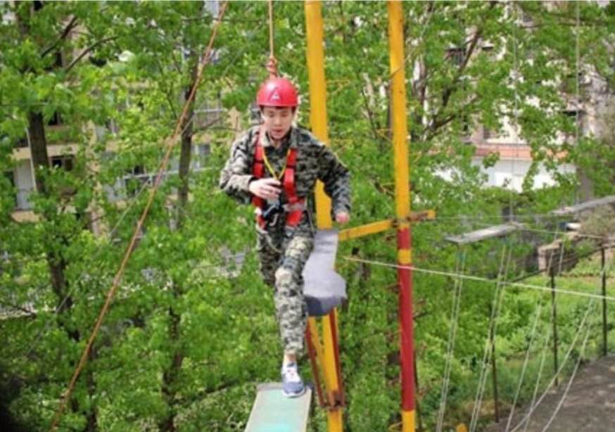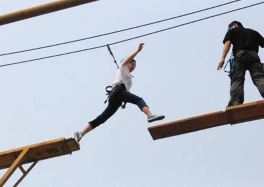 高空斷橋操作流程:學(xué)員站在板上,眼睛注視前方,起步、跨躍、落地。如果有人問你能否一步邁過1.1米的距離,你可能會覺得有些好笑,那有什么難的?但是,試想一下把這個距離放到8米高空,你腳下踩的是一塊只有0.3米寬、1米左右長的鋼板,要跨到另一塊同樣細長的鋼板上,兩者之間雖然只有1.1米,你能保證自己心里一點的也不打鼓嗎?高空斷橋就是通過讓你在高空邁過這艱難一步來進行心理訓(xùn)練,它能令你勇氣倍增。